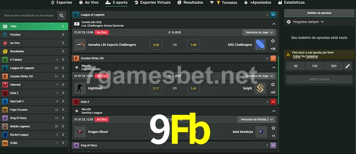 O 9Fb oferece uma grande seleção de opções de apostas em e-sports com probabilidades competitivas